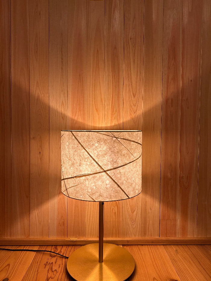 斜めのラインと水滴の模様、円筒型の手漉き和紙のランプシェードです。やわらかく拡散された光を生み出し、寝室やリビングなど、空間に温もりと静けさを添えたい場所に最適です。
