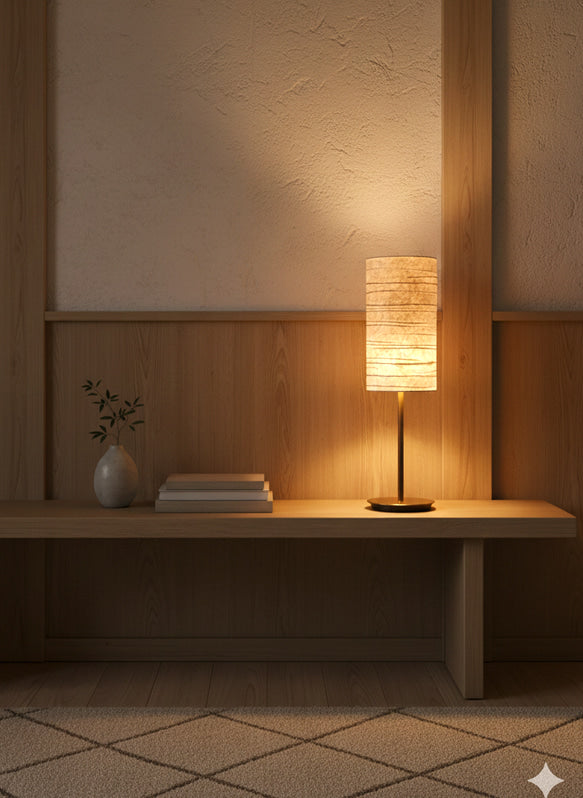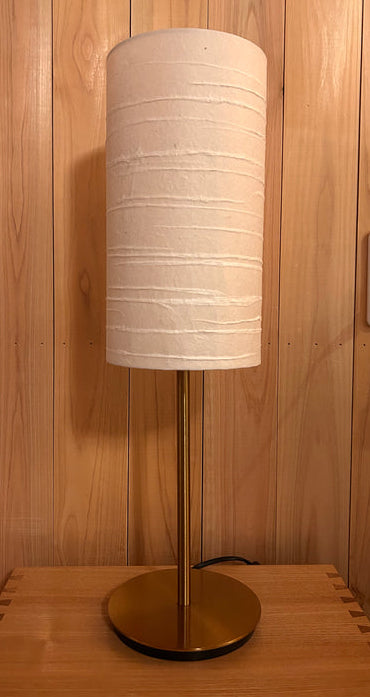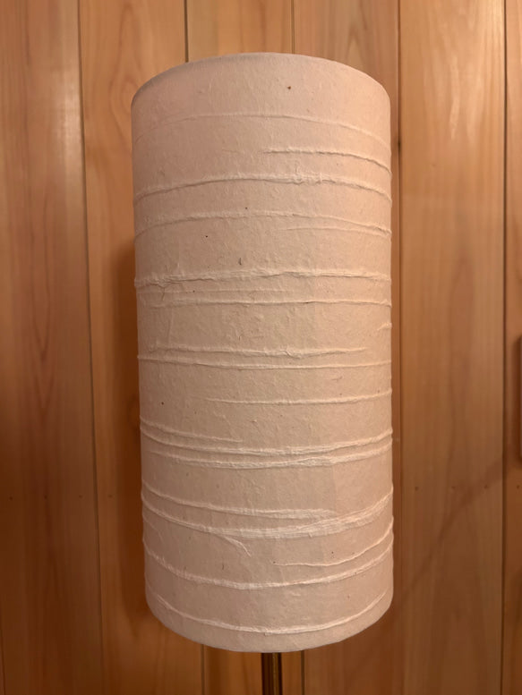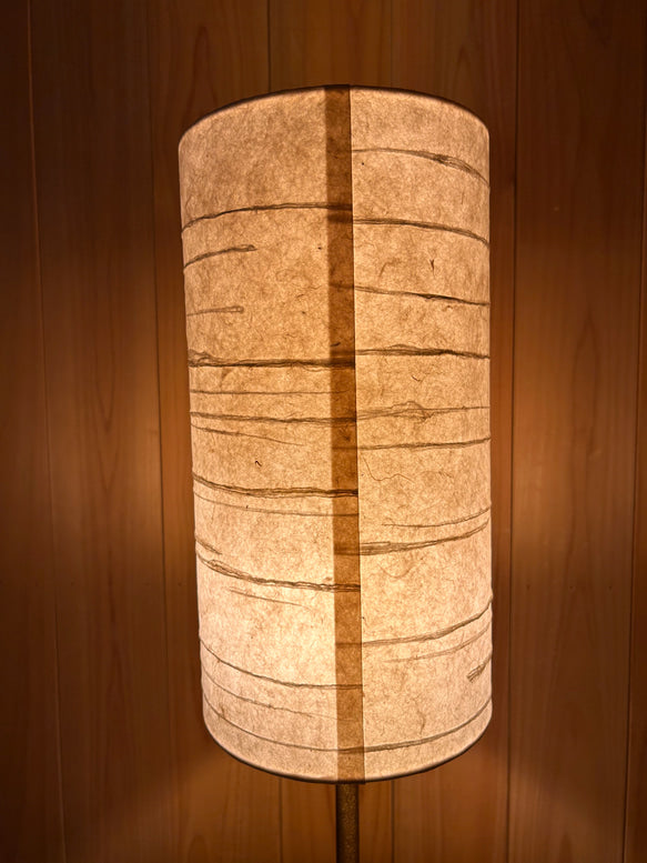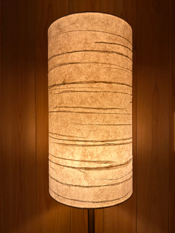 凪を思い浮かべる水平の線の模様、円筒形の手漉き和紙ランプシェードです。やわらかく拡散された光を生み出し、寝室やリビングなど、空間に温もりと静けさを添えたい場所に最適です。